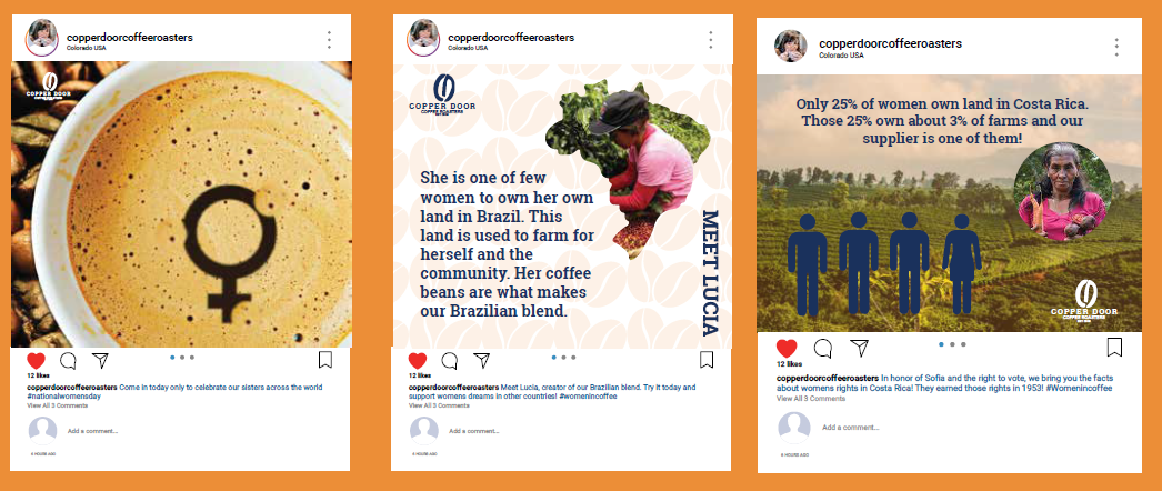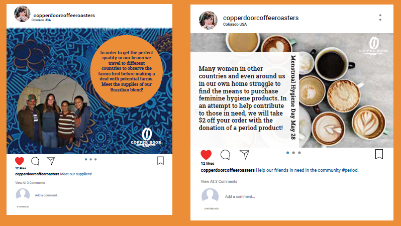 Thought process/Research: I decided I would expand a brand for this project. I picked Copper Door Coffee Roasters because I had gone in and gotten some of the best coffee, and the workers were extremely nice. After doing some initial research, I found that Hannah, the owner, is woman-owned and woman-supported. I thought I could use the skills I have learned to create fictitious print materials that would match the vibe Copper Door exemplifies. For the thank you card I designed, I included the farmer the beans came from so that consumers knew when buying Copper Door Coffee that they would be playing a major role in someone else’s life other than the company owner. Additionally, this thank you note helps others be reminded to be inclusive to others and encourage diversity, which is very prominent today. The thank you card creates positive interactions by leaving a lasting impression on those who buy their coffee, authenticity by helping show how much Copper Door cares about those in need, trust, and loyalty in knowing that your money goes to a good cause while you receive a great product. I also designed a few social media posts and a coupon for the brand to help sell more coffee and again get the word out that they are woman-owned, woman-supported, and a trustworthy company.