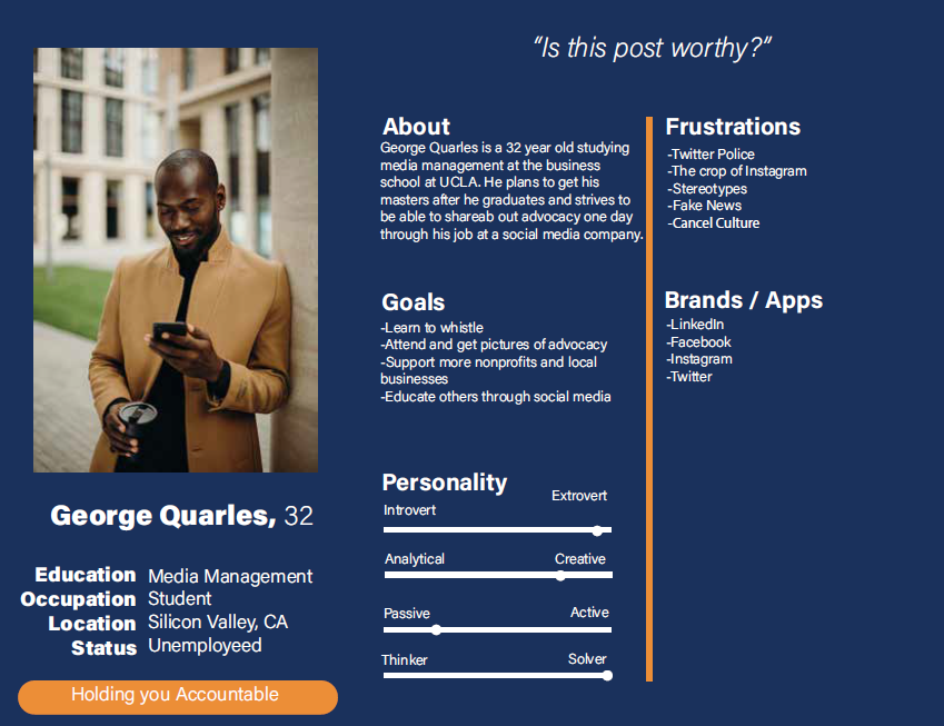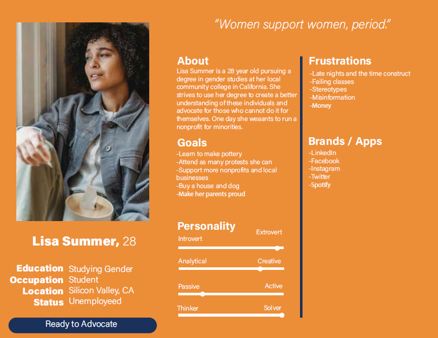 Project Description: Wireframe, prototype, and design i OS or Android mobile application that helps people understand and face social issues within the contemporary world. While designing the app, establish a visual design system for you to reference and utilize while building out the various functionalities.