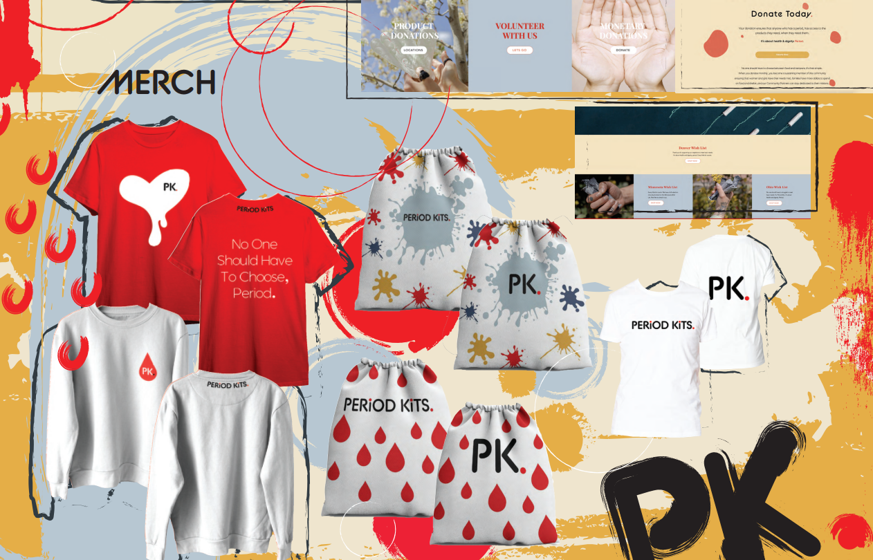 Thought process/Research: Period Kits requested a new website with new imagery as well as many print materials such as posters, social media posts, t-shirts, and a product pouch to hold the period products they give out to those in need. In my group, I was responsible for editing and rebuilding the website as well as making the t-shirts and product pouches, and the final poster.